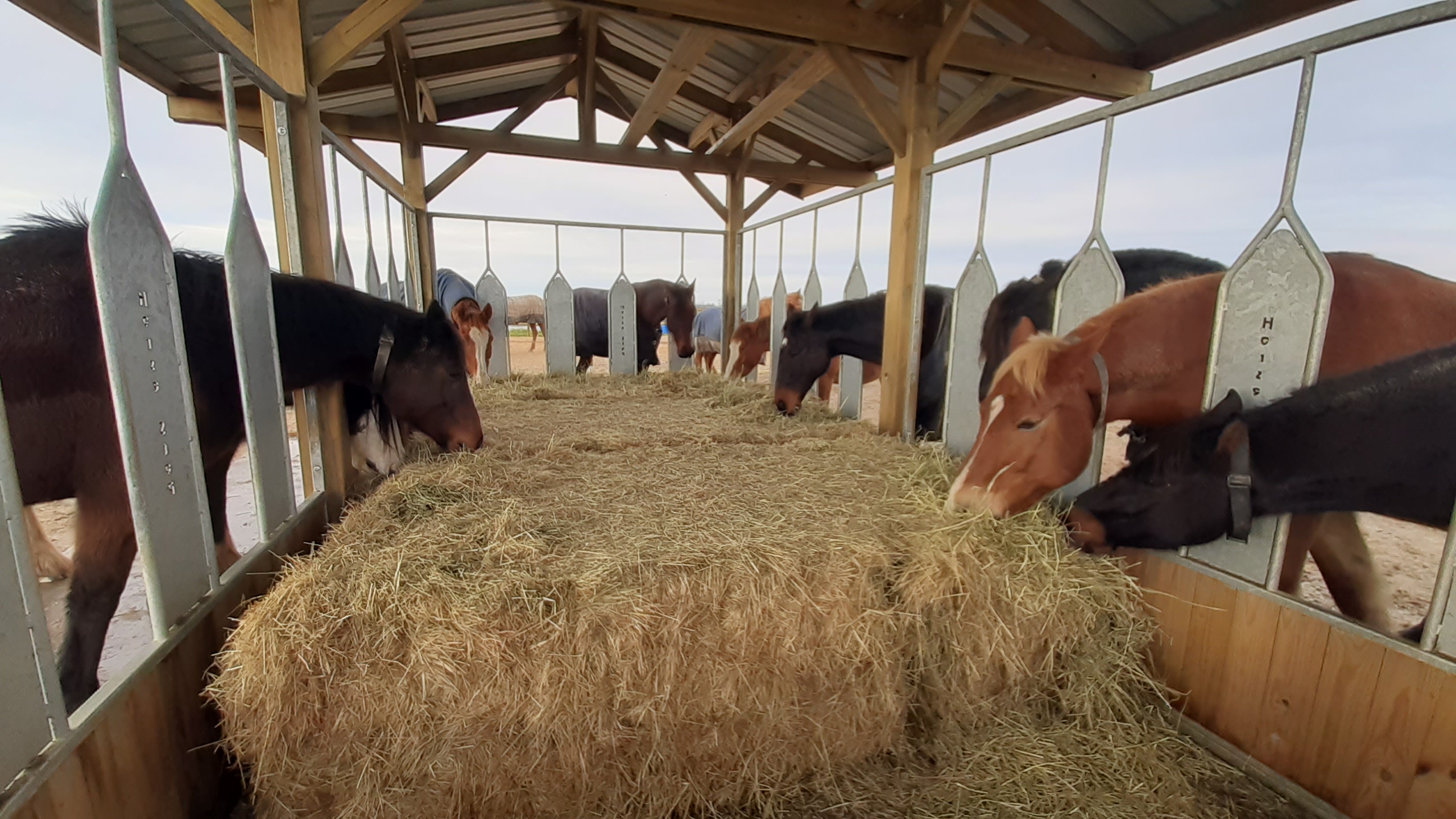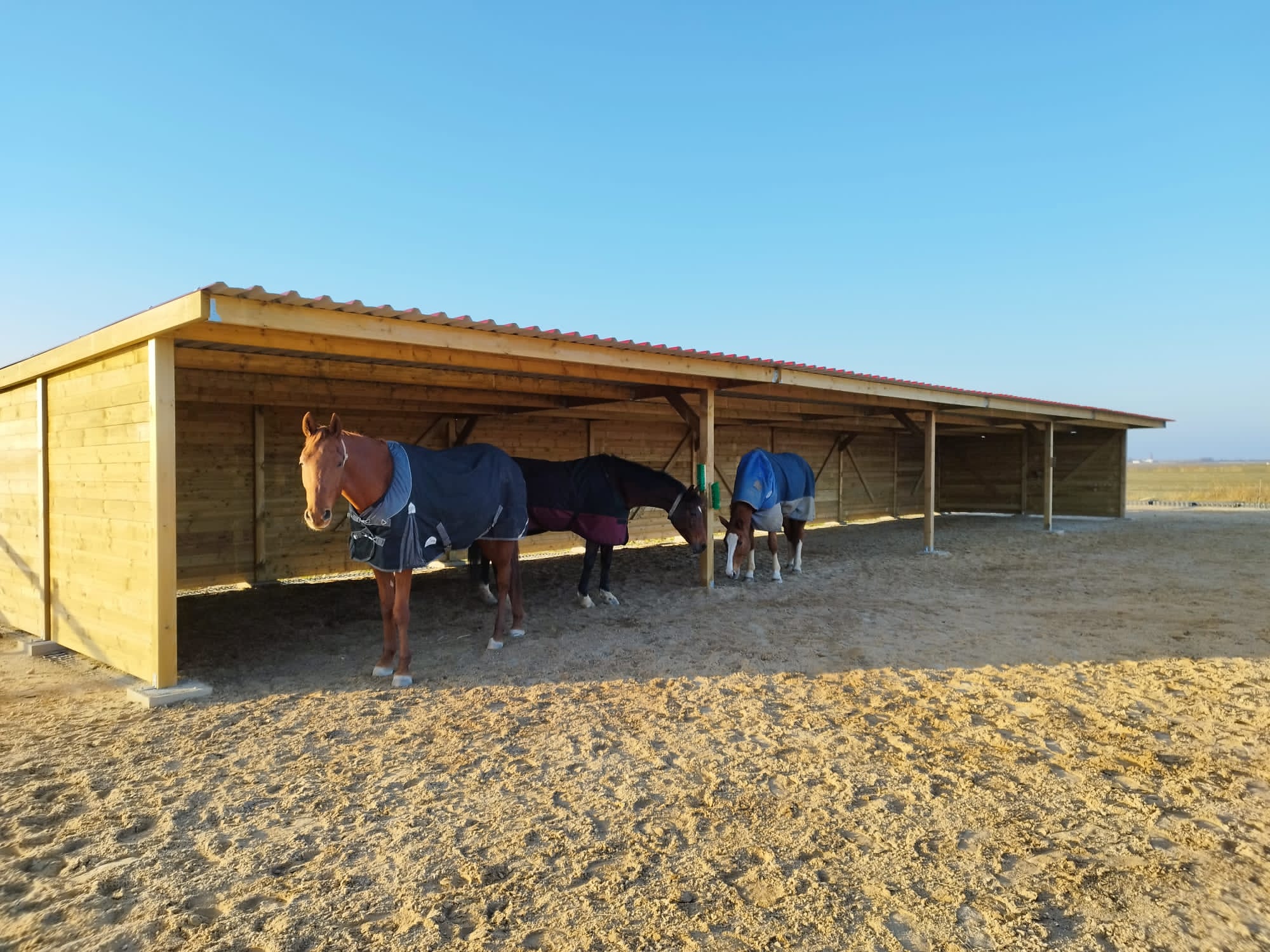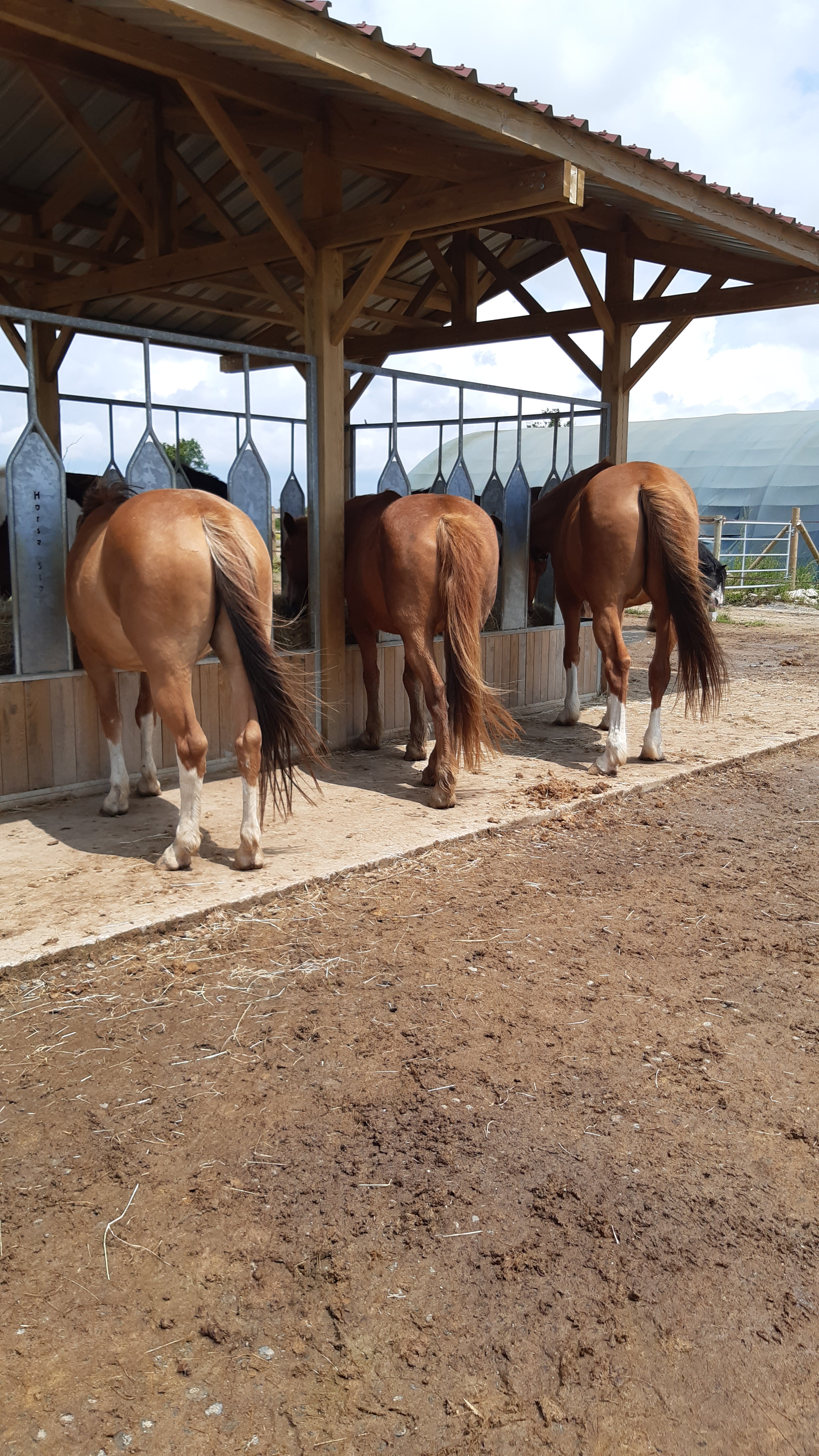 Les poneys et chevaux sont hébergés en écurie active. Ils vivent en troupeau de 35 chevaux maximum sur une zone stabilisée avec abris, foin à volonté et l’accès si nécessaire au distributeur automatique de granulés.