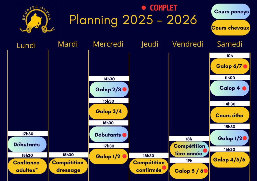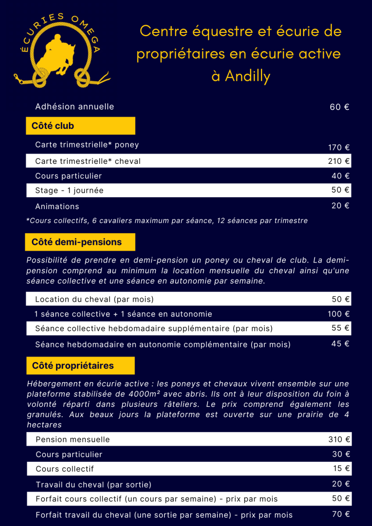 Des cours collectifs sont proposés chaque semaine. Pour un meilleur suivi et une individualisation de l’enseignement, les cours accueilleront au maximum 6 cavaliers. Les écuries Omega ont a cœur de proposer une cavalerie de qualité, travaillée régulièrement par les gérantes et permettant aux cavaliers de progresser et d’évoluer quel que soit leur niveau.