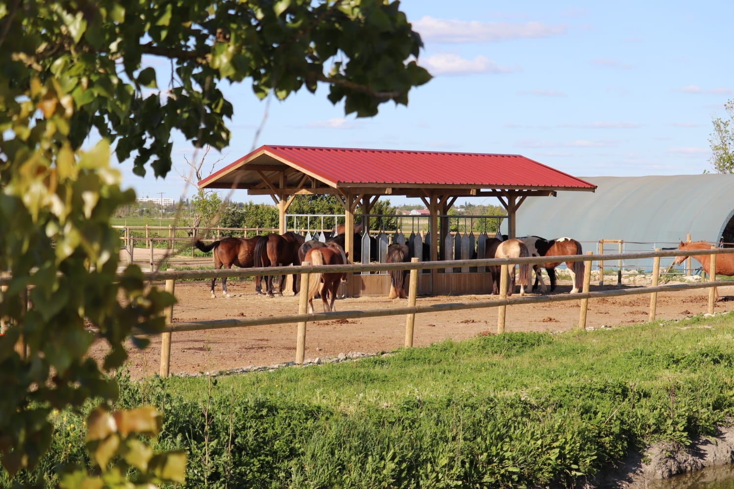 Les équidés vivent en troupeau dans une zone stabilisée de 4000 m² avec abris sur laquelle sont répartis les divers points d’intérêts (râteliers à foin, distributeur de granulés, zone sablée, abris…) afin de favoriser leurs déplacements et préserver l’harmonie du troupeau. L’été, l’espace de vie est ouvert progressivement sur une prairie de 4 hectares pour la mise à l’herbe.